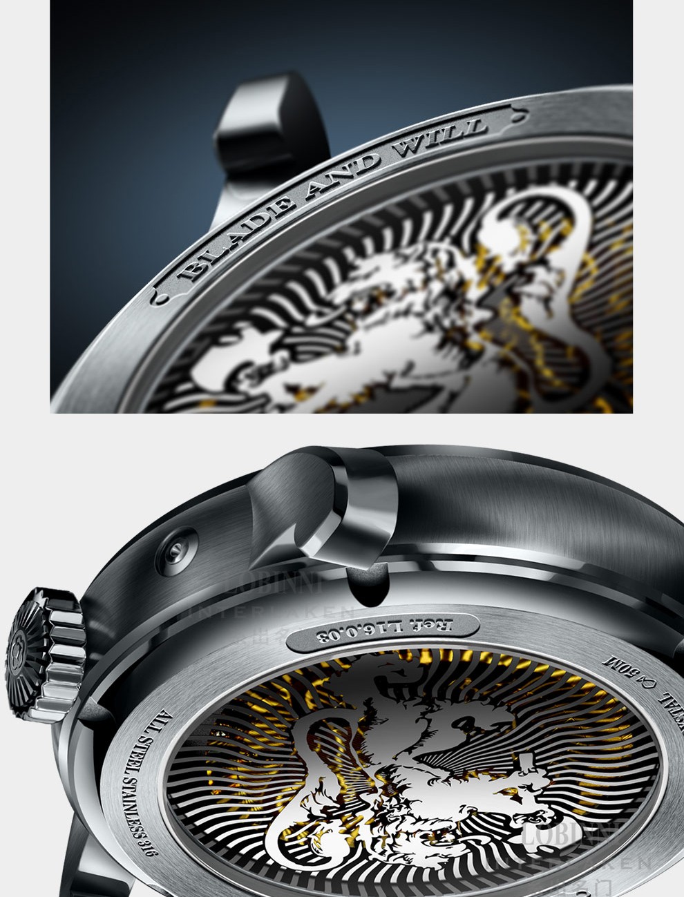 罗宾尼 男士全自动机械表 防水大表盘16003 银壳黑面黑皮