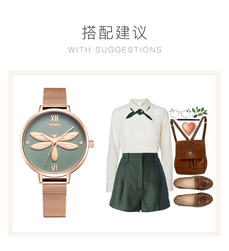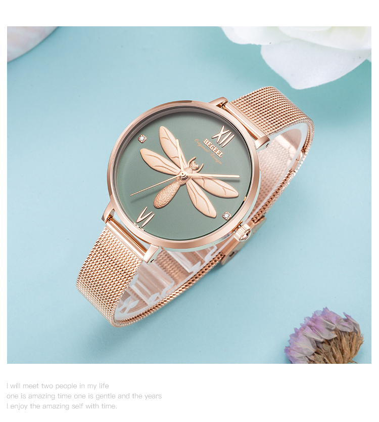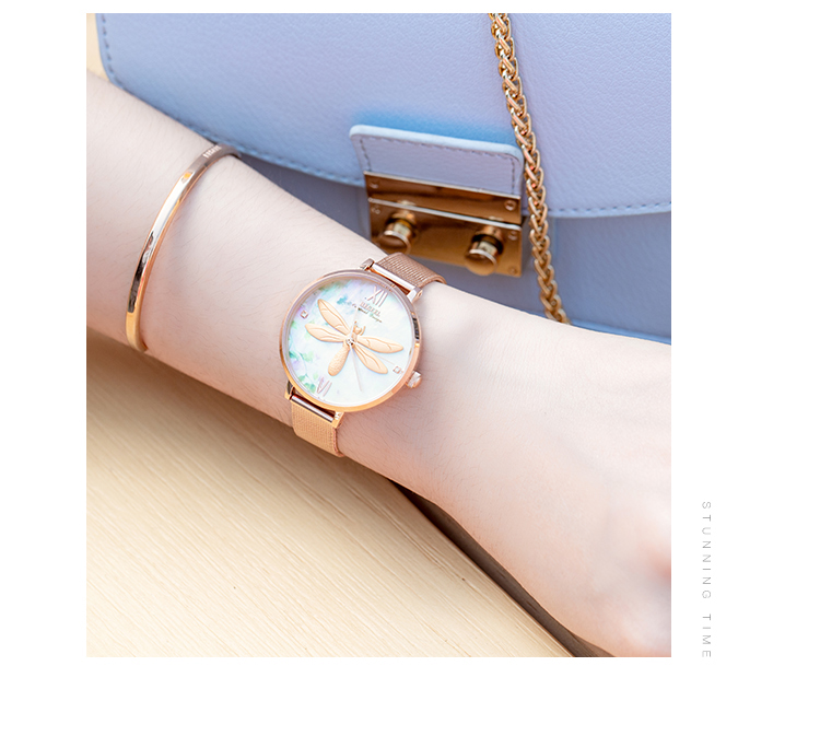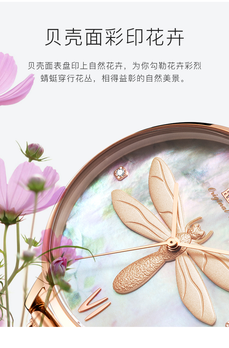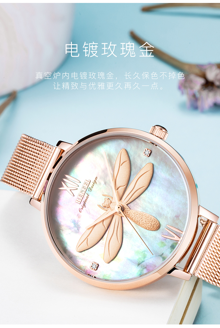 宾爵(BEGEEL)新品上市 进口机芯优雅蜻蜓石英女表 B9662L 玫壳蜻蜓白面网带