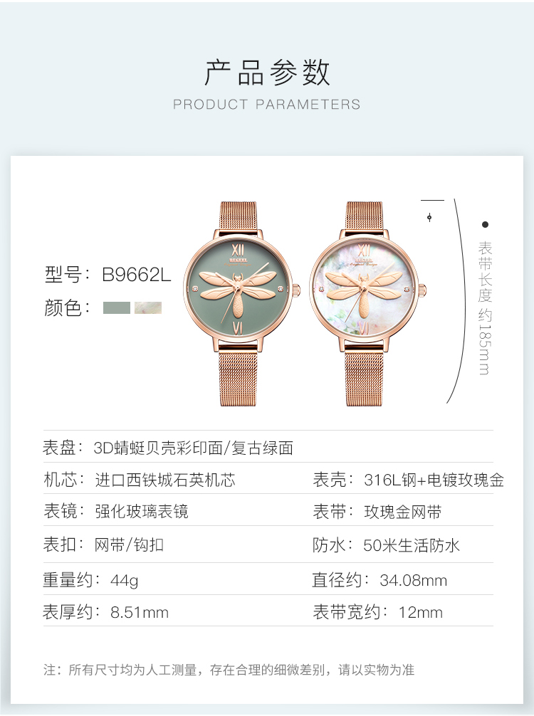 商品名称:宾爵(BEGEEL)新品上市 进口机芯优雅蜻蜓石英女表 B9662L 玫壳蜻蜓白面网带