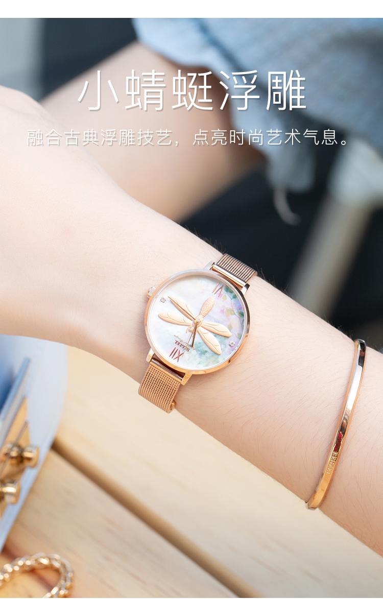 宾爵(BEGEEL)新品上市 进口机芯优雅蜻蜓石英女表 B9662L 玫壳蜻蜓绿面网带