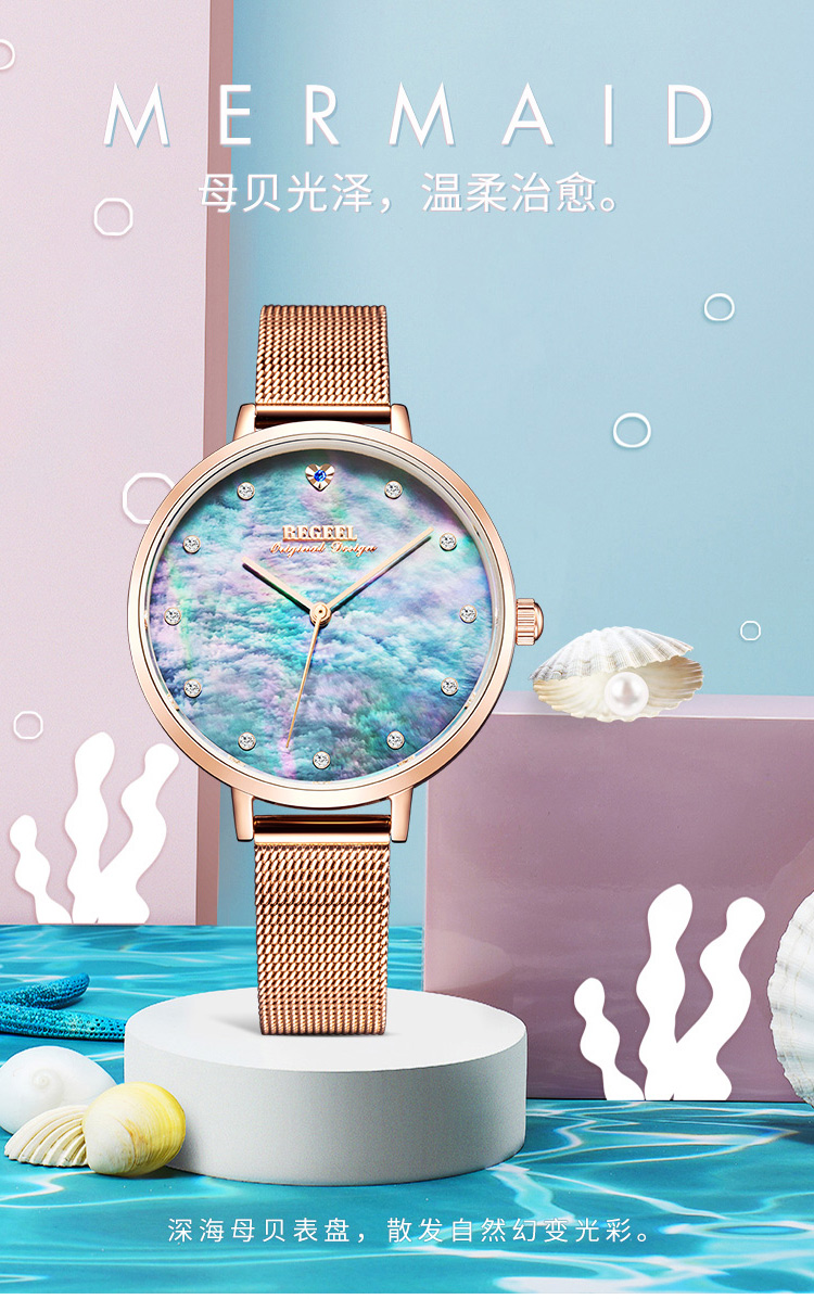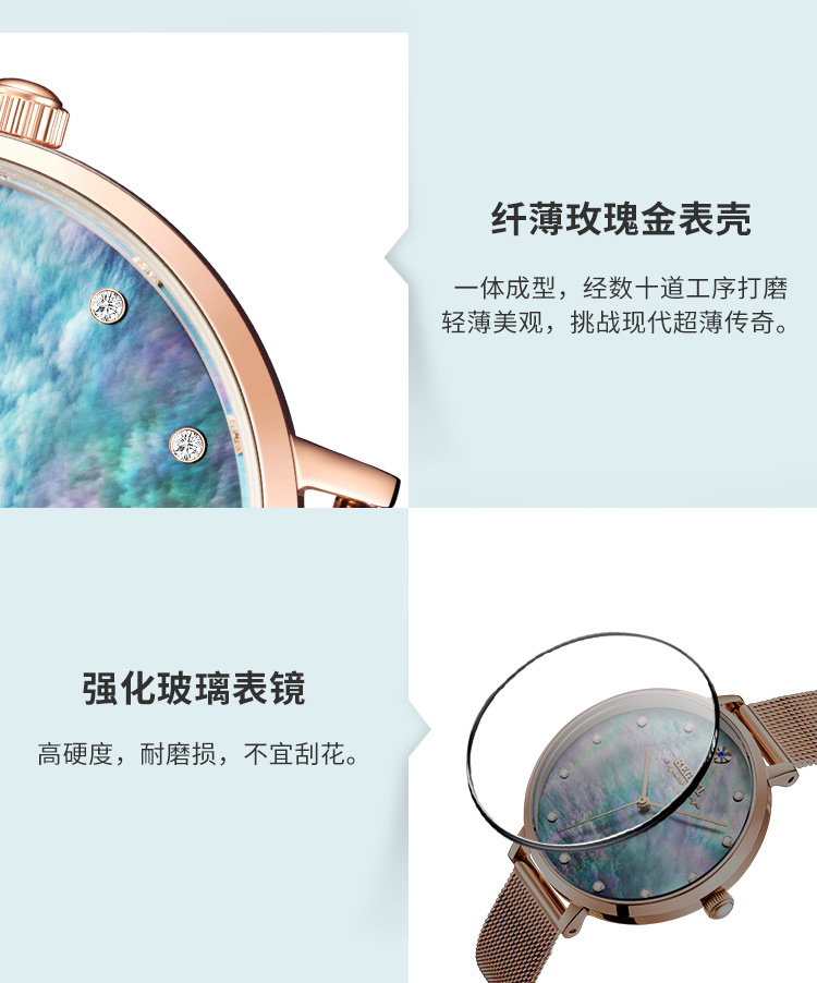 商品名称:宾爵(BEGEEL)手表 自然系列玫瑰金网带时尚女士石英腕表美人鱼·蓝母贝 B9667L蓝贝壳玫瑰金网带