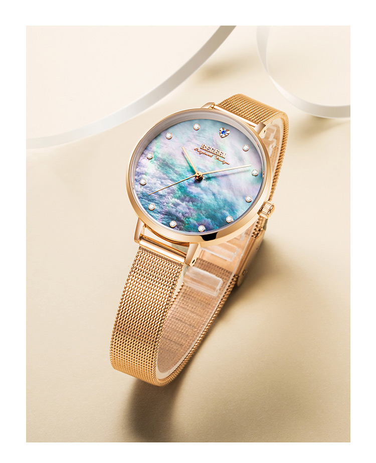 宾爵(BEGEEL)手表 自然系列玫瑰金网带时尚女士石英腕表美人鱼·蓝母贝 B9667L蓝贝壳玫瑰金网带
