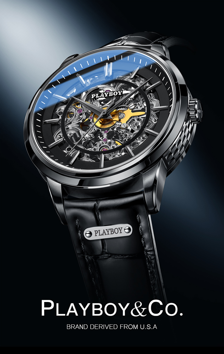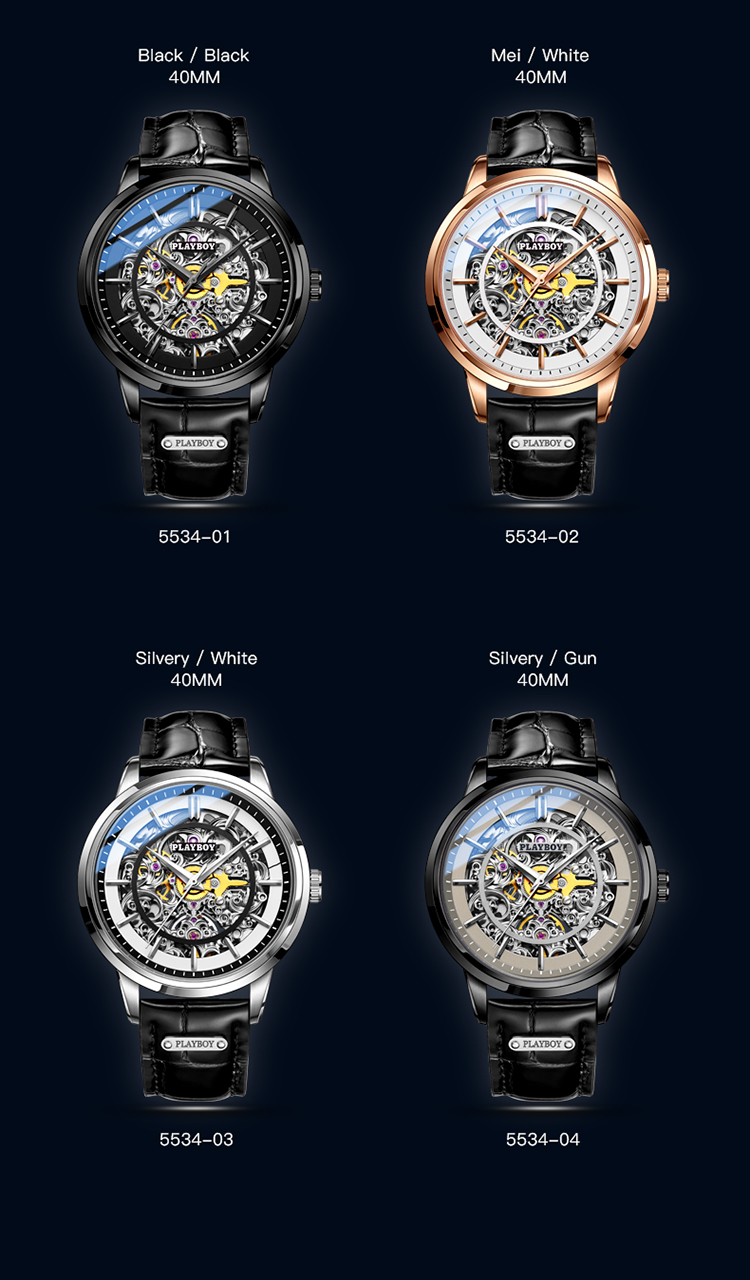 花花公子(PLAYBOY)雕花镂空原装进口全自动机械男表 5534 黑边灰面皮带