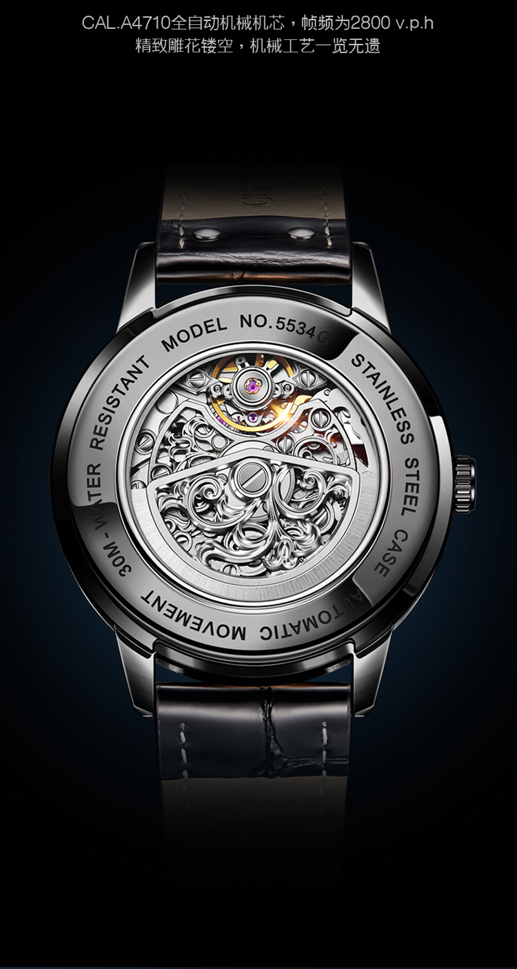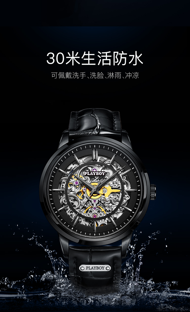 商品名称:花花公子(PLAYBOY)雕花镂空原装进口全自动机械男表 5534 黑边灰面皮带