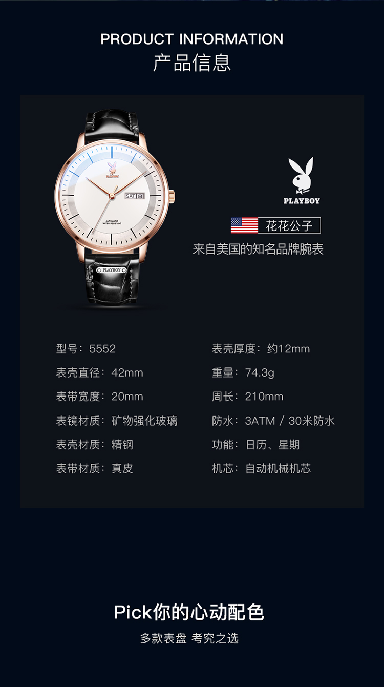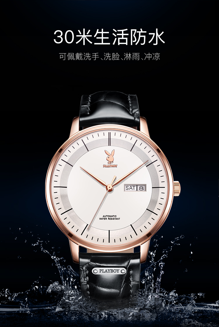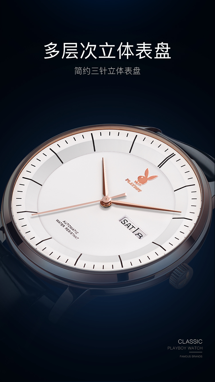 商品名称:花花公子(PLAYBOY) 全自动简约机械男表 玫边白面皮带5552