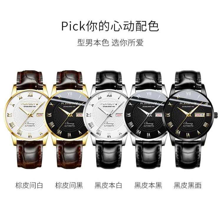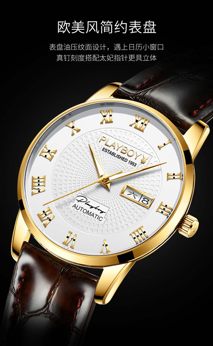 商品名称:花花公子 真皮带男士机械手表 2605间金黑(超薄简约系列)