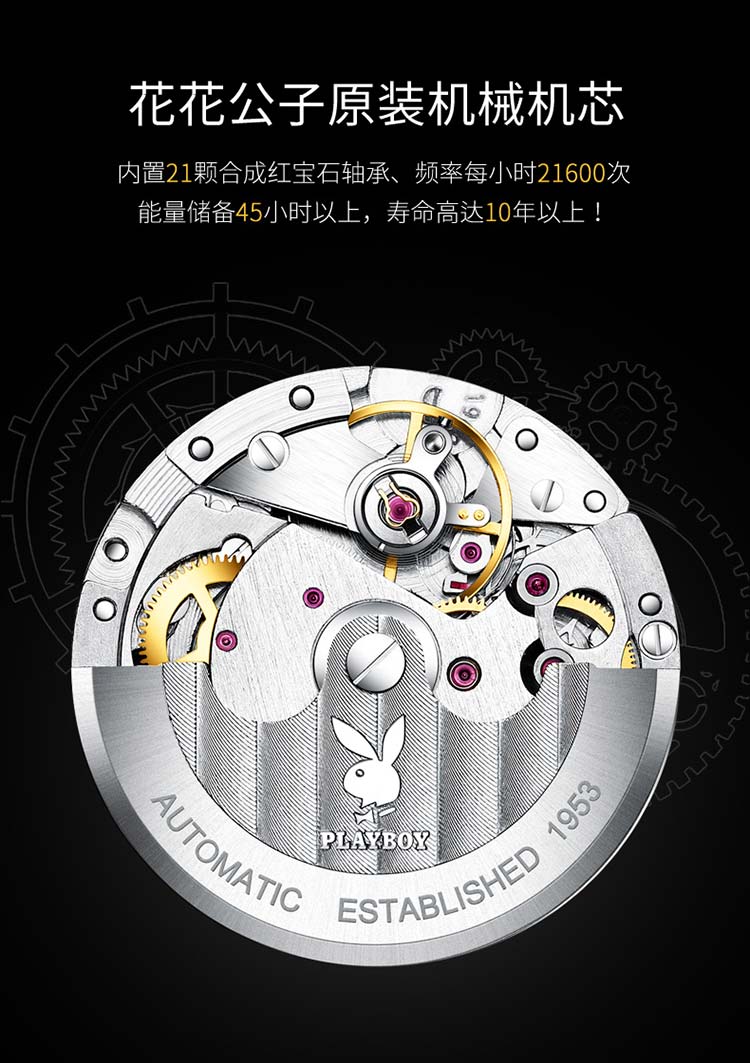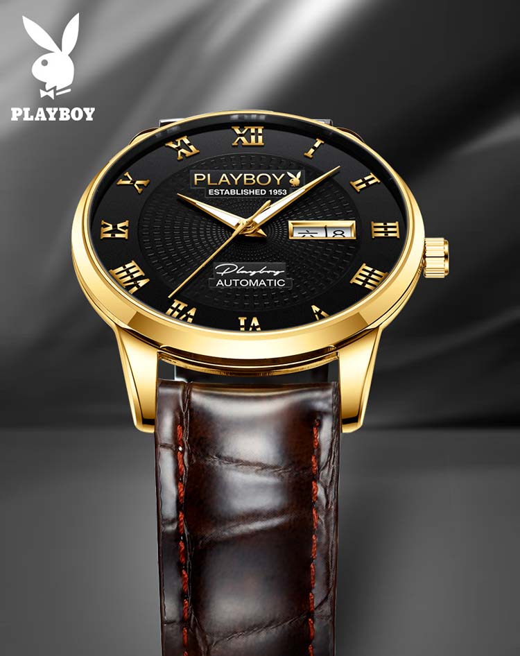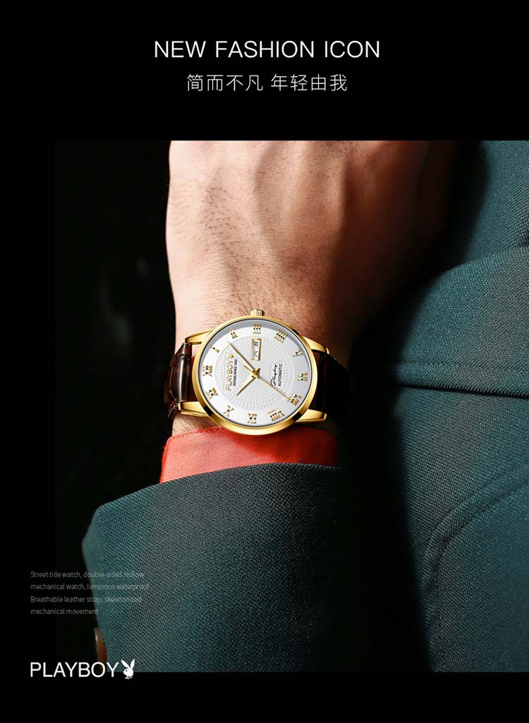 花花公子 真皮带男士机械手表 2605间金黑(超薄简约系列)
