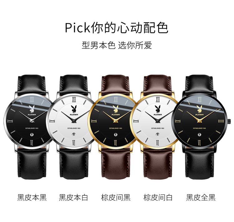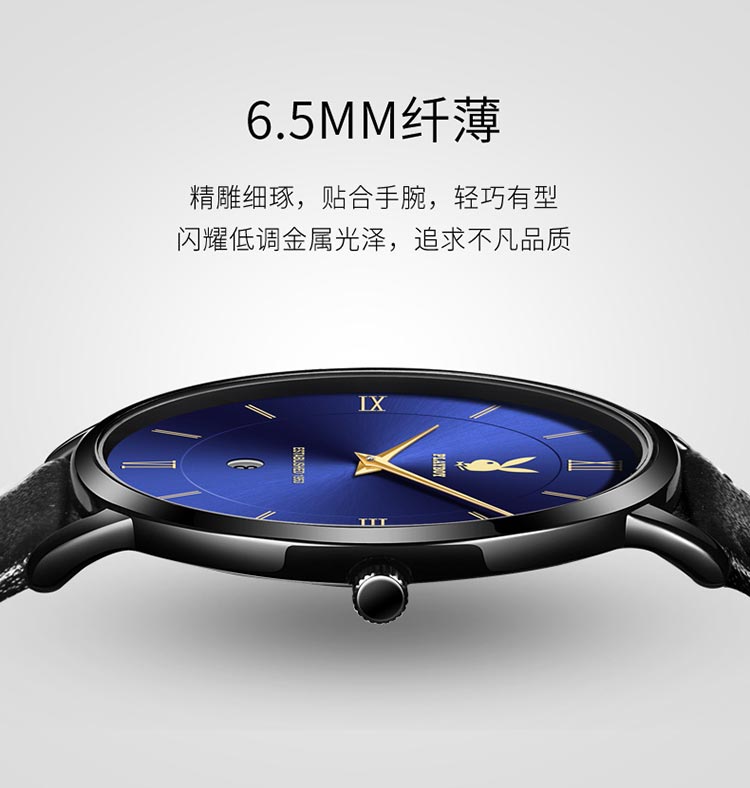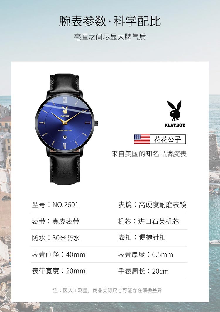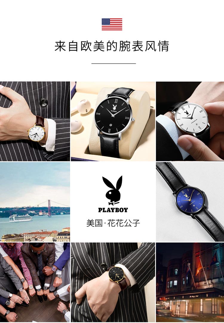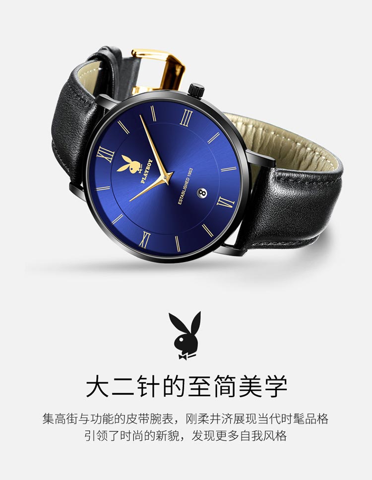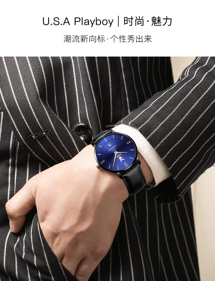 花花公子(PLAYBOY)超薄简约皮带防水男表2601 蓝面黑壳黑皮带