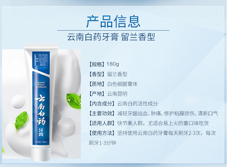 商品名称:云南白药牙膏留兰香型 180g*4支 6901070600579