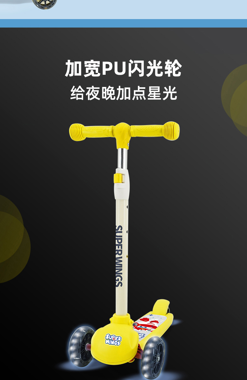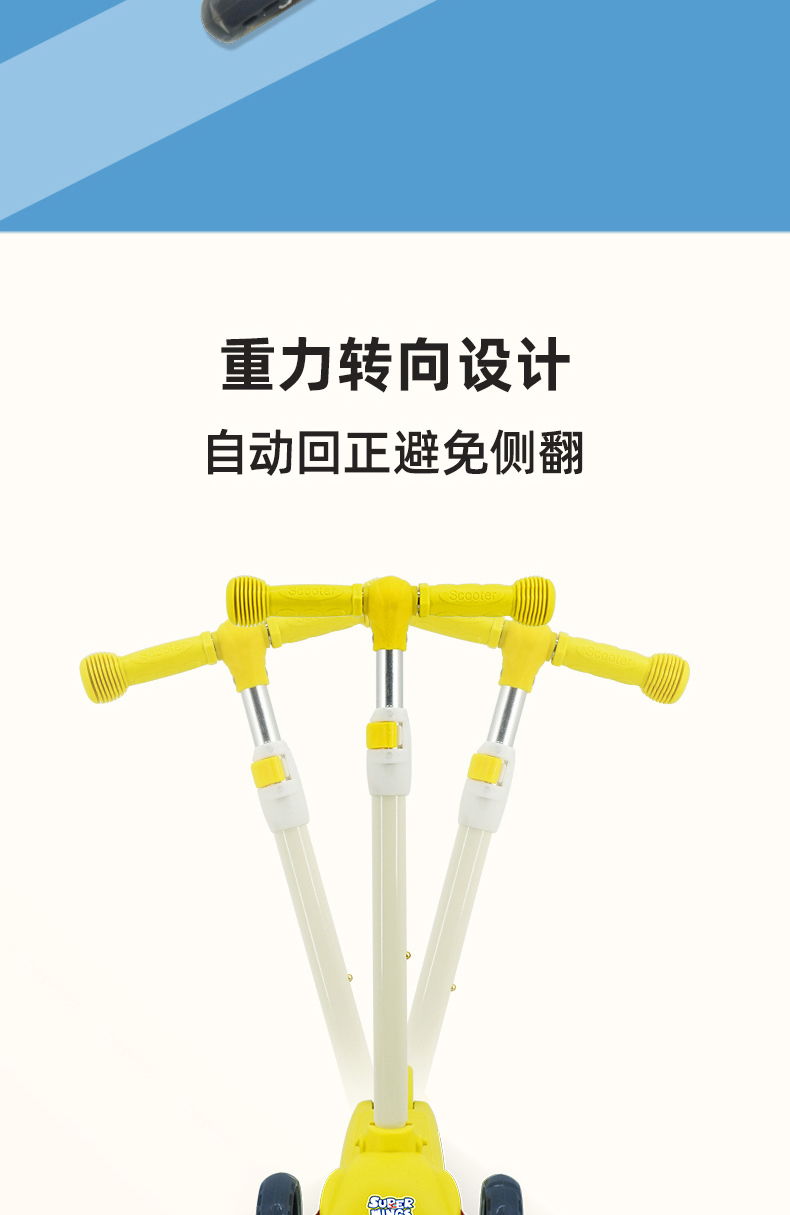 加厚高碳钢车杆,铝合金手把,结实耐用,安全性高;重力转向操纵,灵活掌控方向,锻炼宝宝平衡力;加厚PU闪光避震轮,加宽后轮
