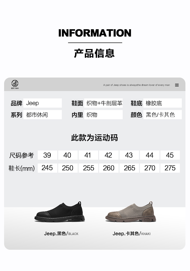 商品名称:jeep 薄款休闲懒人一脚蹬鞋 P221M11012 39-45码 卡其色/黑色 可选下单备注颜色尺码