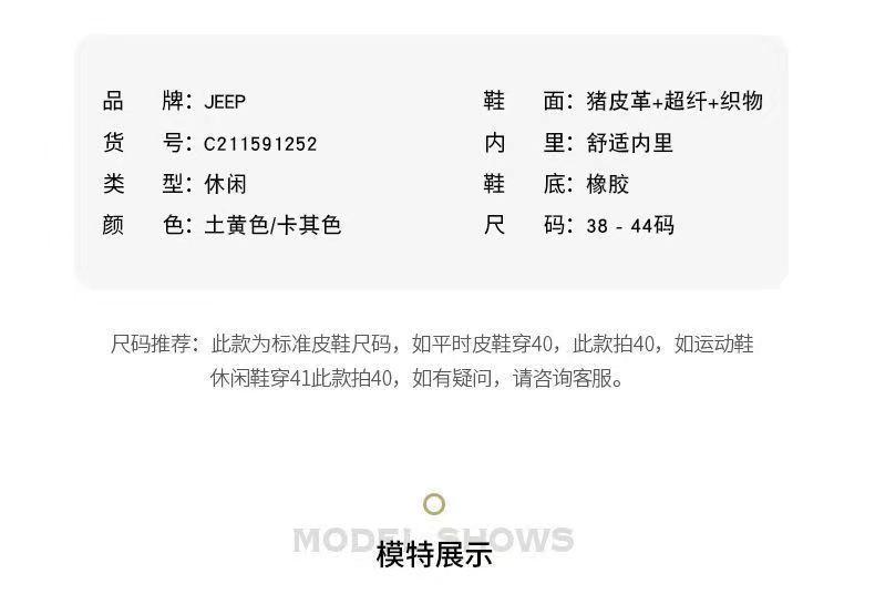 商品名称:jeep 潮流百搭休闲鞋 C211591252 卡其色 /土黄色 38-44码 可选下单备注颜色尺码