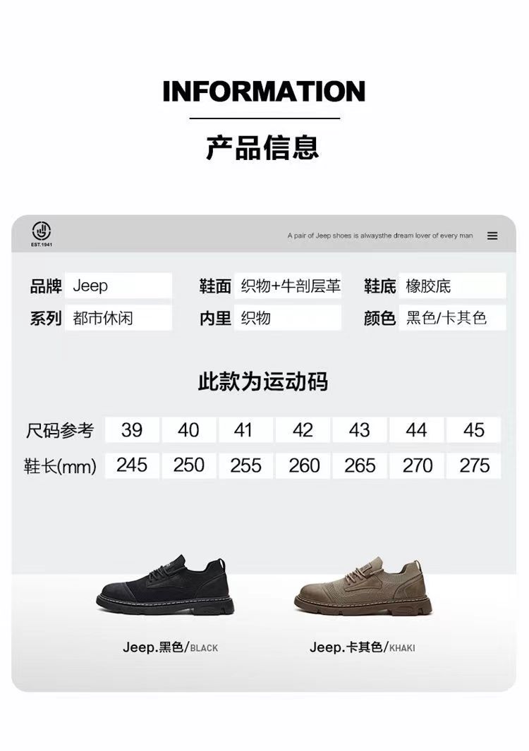 商品名称:jeep 英伦网面运动鞋 P221M11029 黑色/卡其色 39-45码 可选下单备注颜色尺码