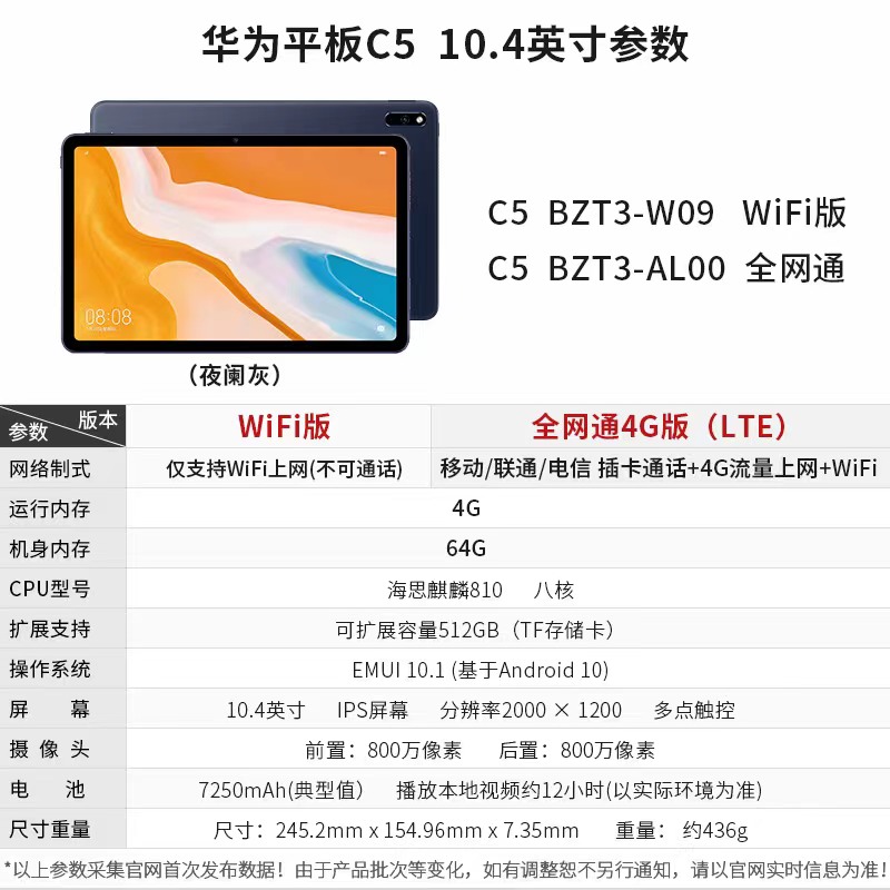 商品名称:华为 商用平板电脑 C5 10.4英寸 BZT3-AL00(64GB+4GB) 夜阑灰 通话版