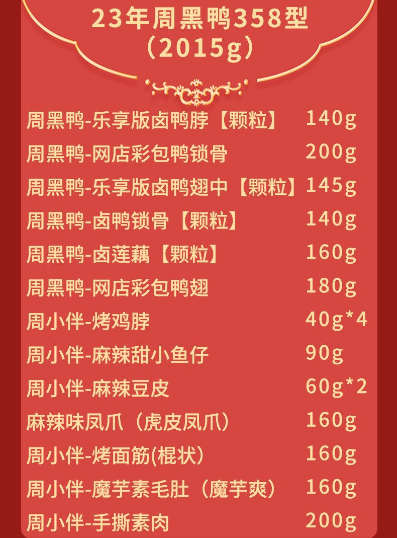 商品名称:周黑鸭 23年358型礼盒2015g(卤鸭脖140g+鸭锁骨200g+卤鸭翅中145g+锁骨140g+卤莲藕160g+鸭翅180g+烤鸡脖40g*4+小鱼仔90g+麻辣豆皮60g*2+凤爪160g等)