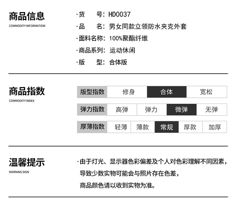 商品名称:啄木鸟 男女同款立领夹克HD0037 M-4XL 黑色/藏蓝色/灰绿色/雾霾蓝/大红色 可选下单备注颜色尺码
