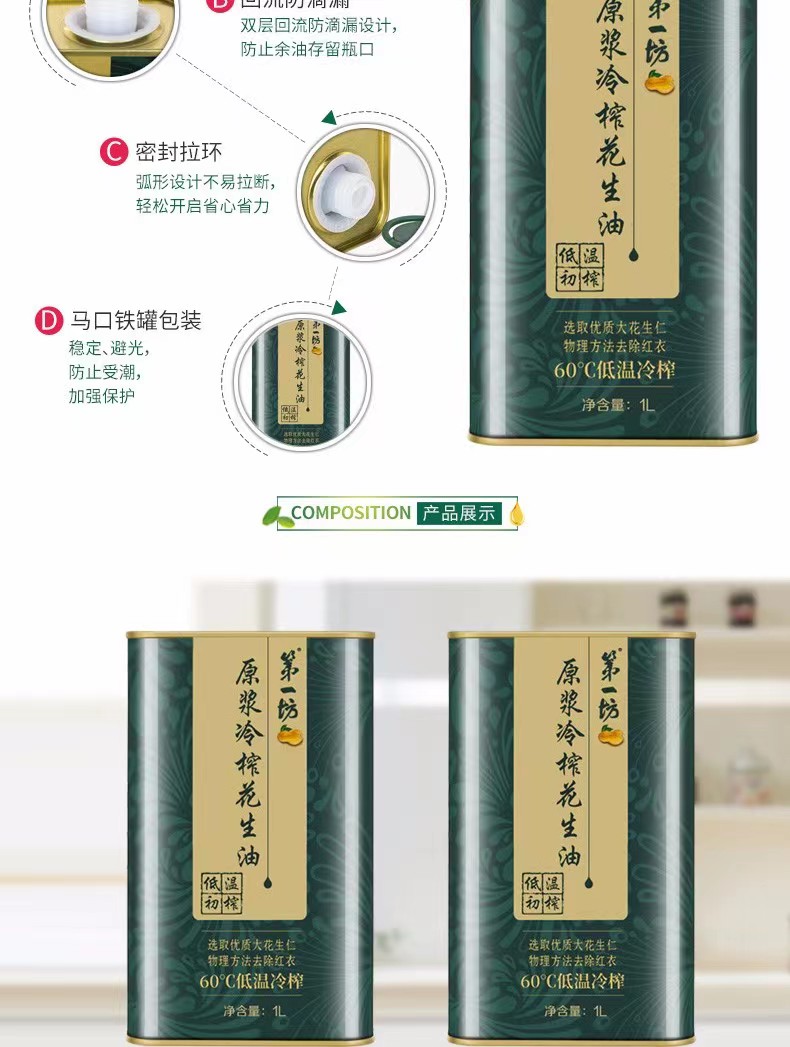 商品名称:第一坊 冷榨花生油铁桶礼盒(1L*2)
