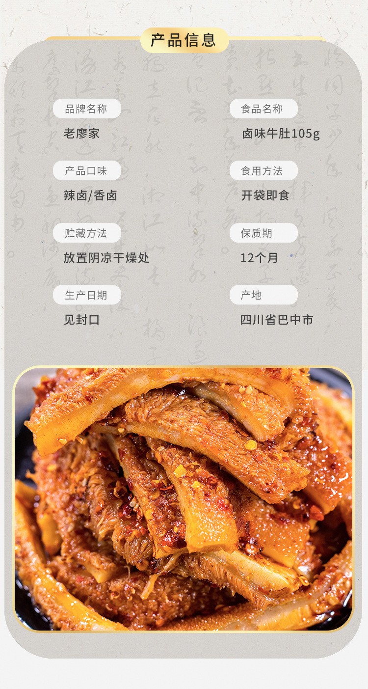 商品名称:老廖家四川特产蜀香麻辣卤牛肚佐餐毛肚休闲小零食卤制品熟食牛肚 辣卤味105g