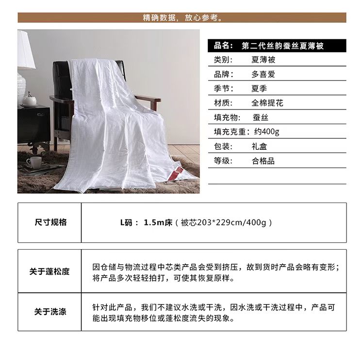 商品名称:Dohia多喜爱 第二代多喜爱丝韵蚕丝被 L/203*229cm(400G)