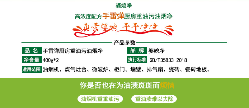 商品名称:婆媳净手榴弹厨房油烟净+(400g*2)/每组*1