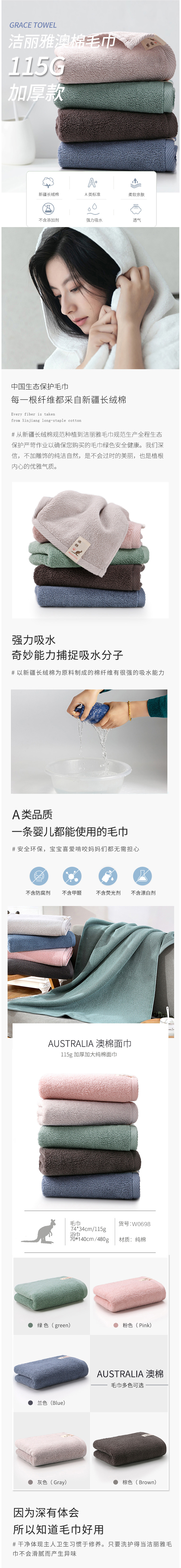 洁丽雅 Grace毛巾一浴两面-澳棉34*74cm+70*140cm 绿/棕/蓝/灰/驼/粉 颜色随机发