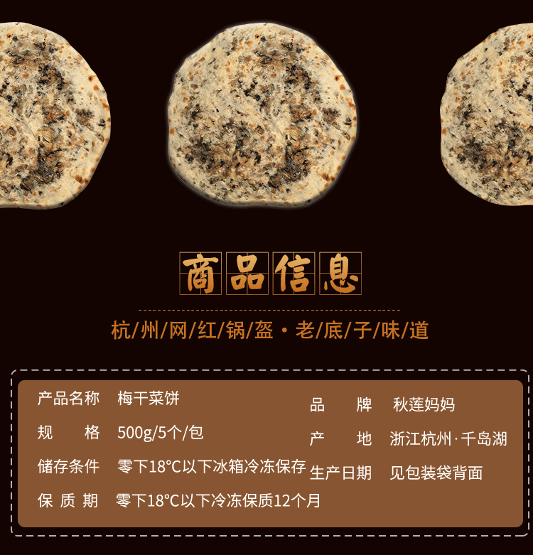 商品名称:秋莲妈妈梅干菜饼大饼 500g*2(辣&原味 5个/袋)