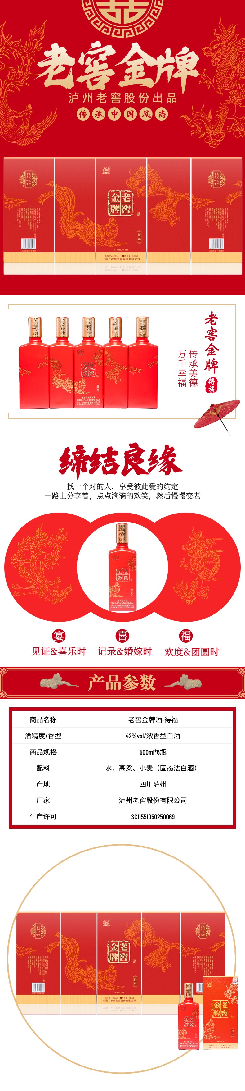 商品名称:泸州老窖 老窖金牌酒得福 龙凤呈祥42°浓香型 1箱*6瓶*500ml