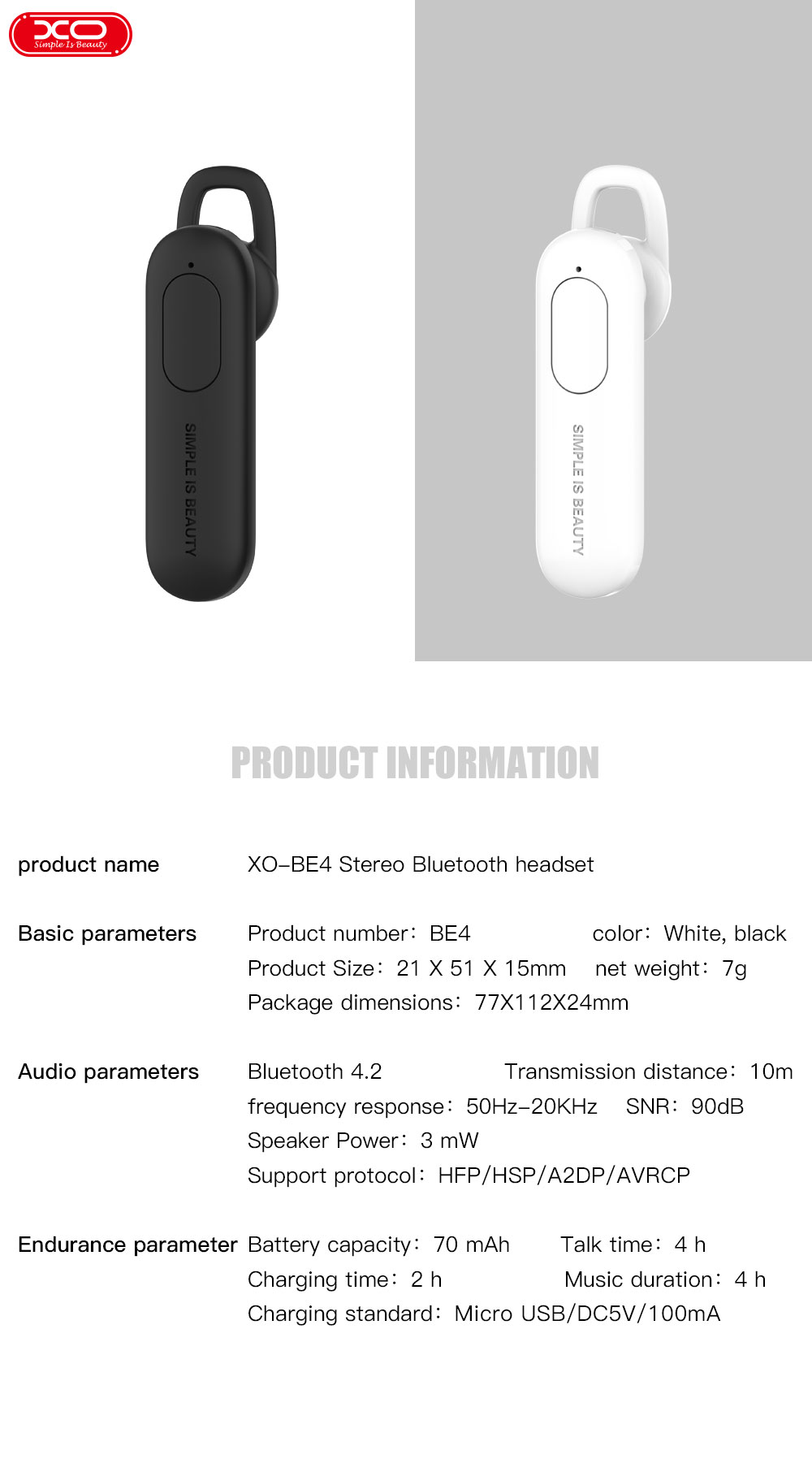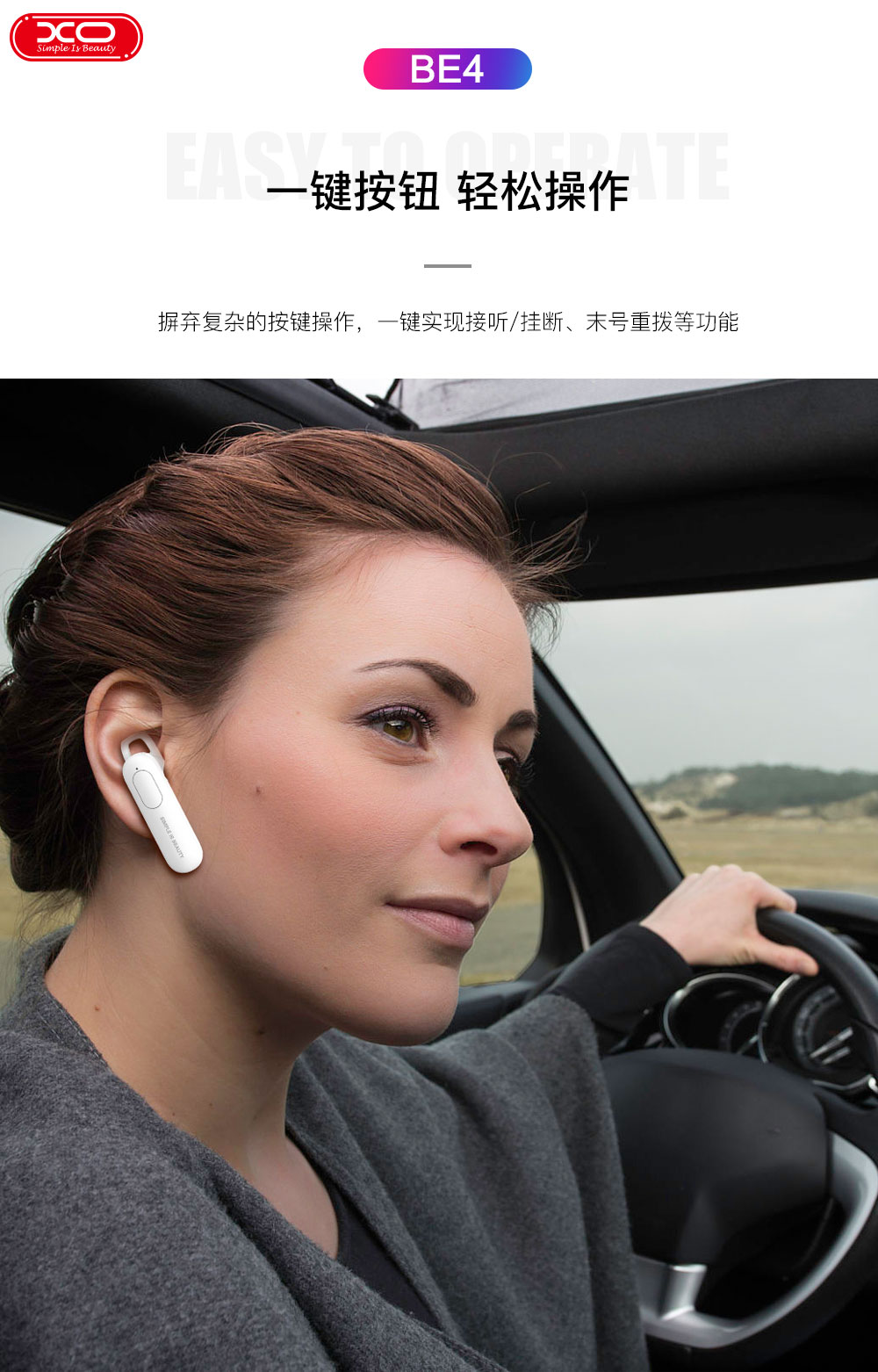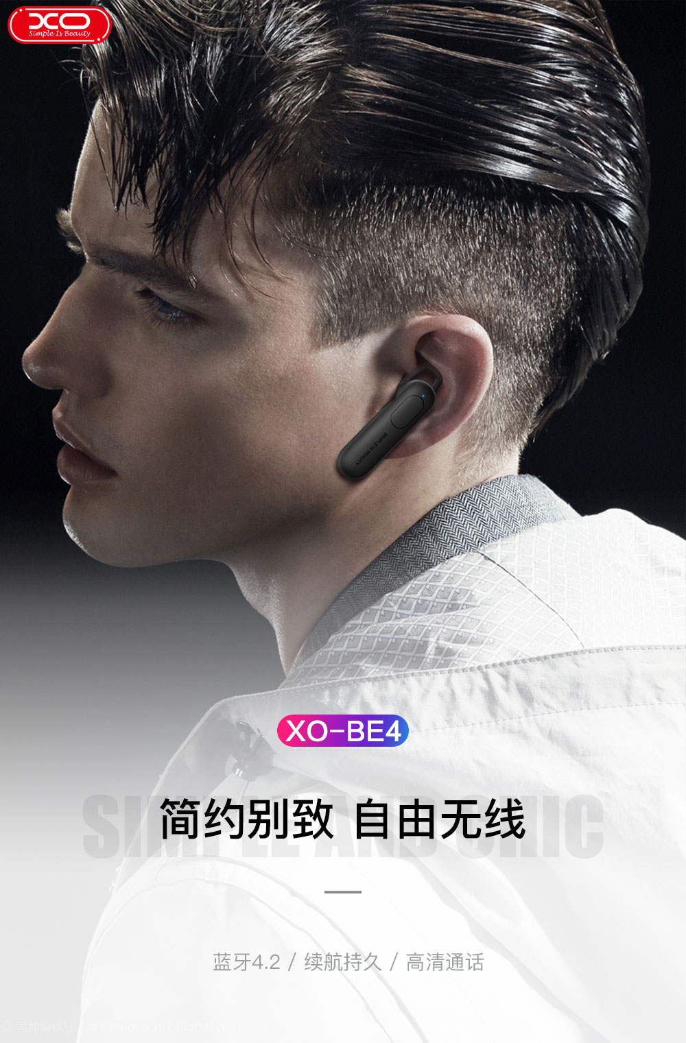 商品名称:XO 单边蓝牙耳机BE4 黑/白 可选下单备注颜色