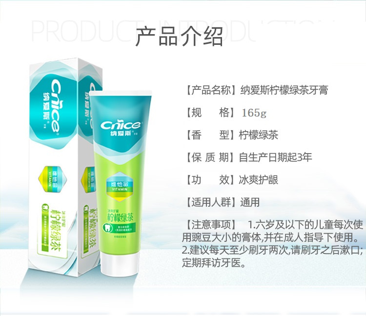商品名称:纳爱斯柠檬绿茶牙膏165g*3 6910019019099