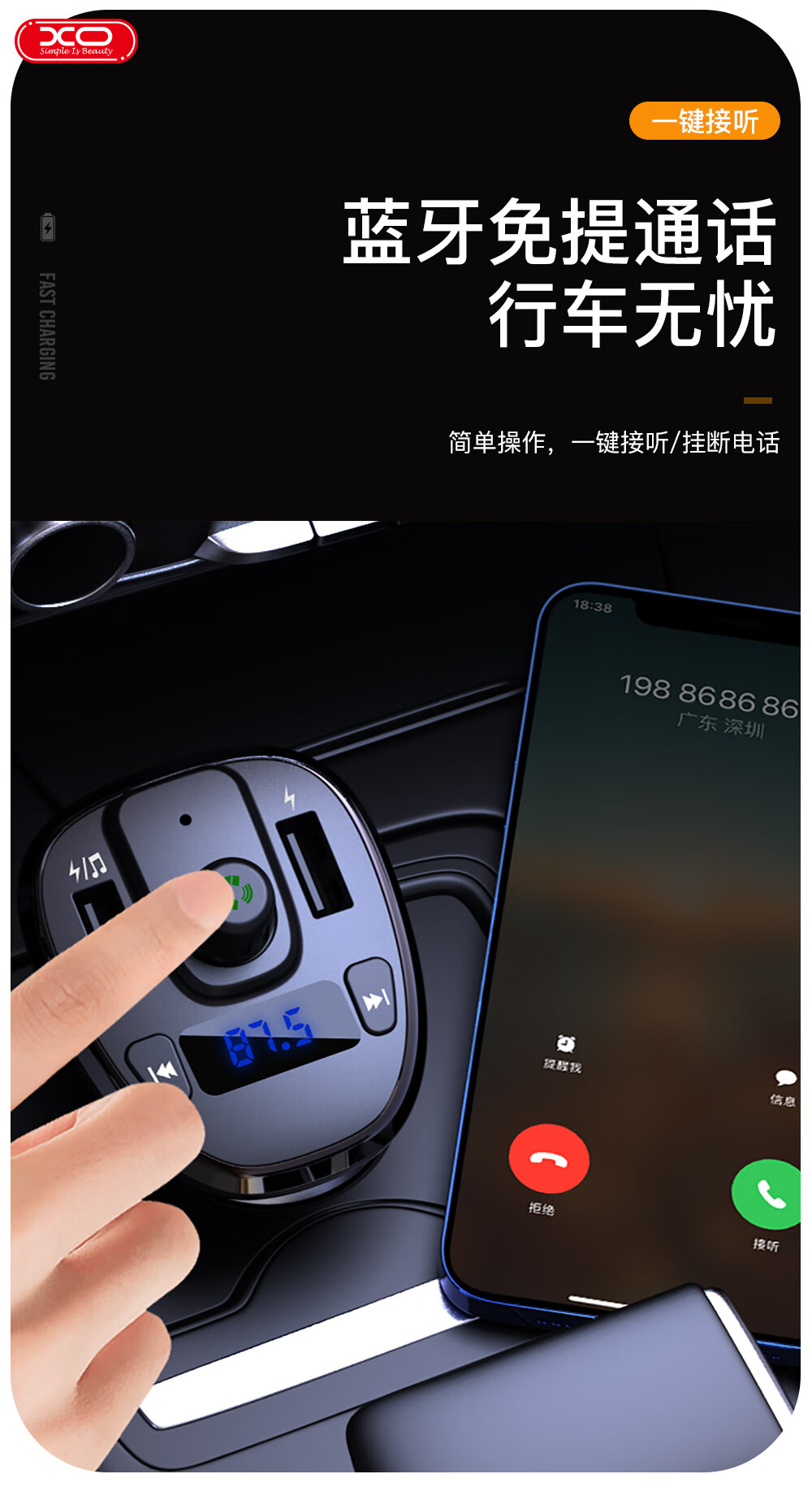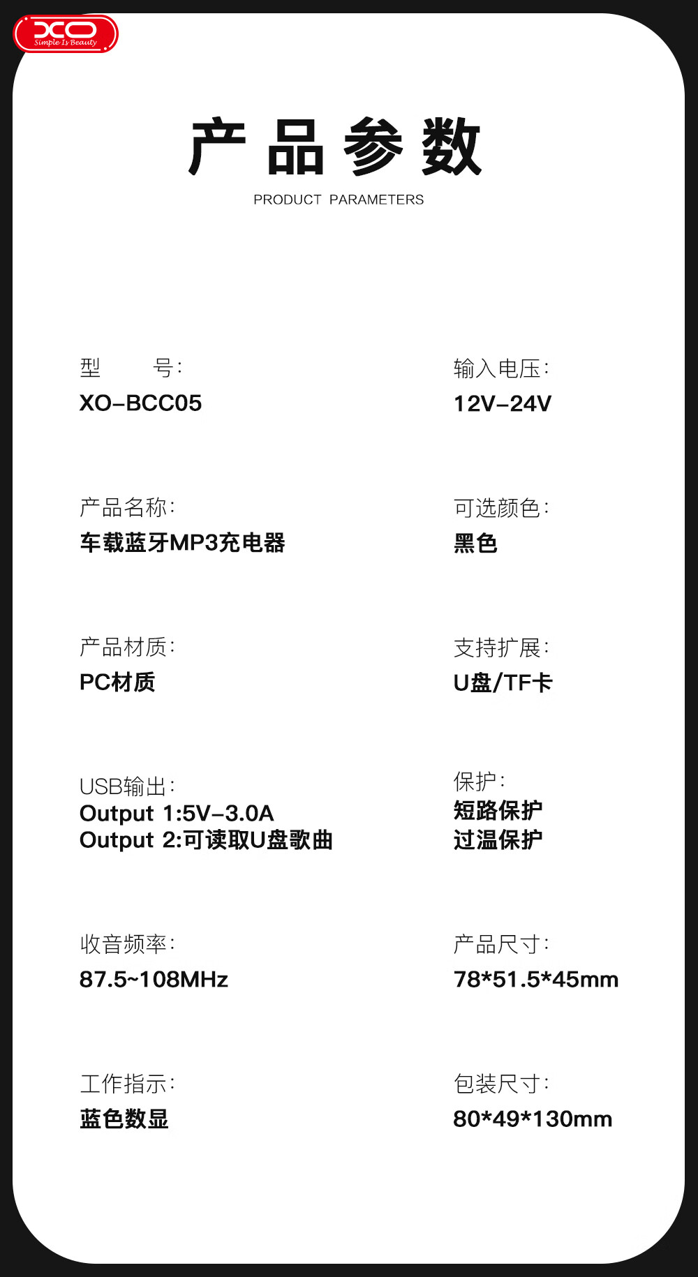 商品名称:XO-BCC05 智能蓝牙MP3+TF卡槽位 数显双USB3.0A车载充电器 黑色