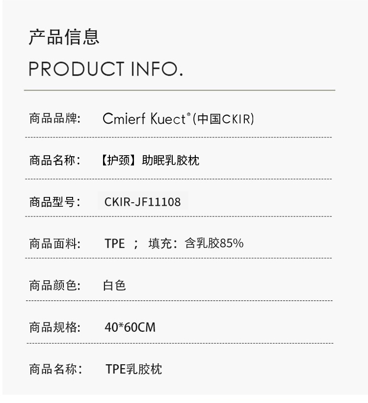 Cmierf Kuect (中国CKIR)TPE乳胶枕40*60cm CKIR-JF11108 白色 (新疆,西藏,宁夏,青海,内蒙古,甘肃,黑龙江,吉林,辽宁不发货)