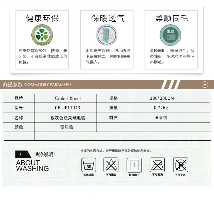 商品名称:Cmierf Kuect (中国CK)温裕纯色银灰法莱绒毛毯180*200cm CK-JF11043 (新疆,西藏,宁夏,青海,内蒙古,甘肃,黑龙江,吉林,辽宁不发货)