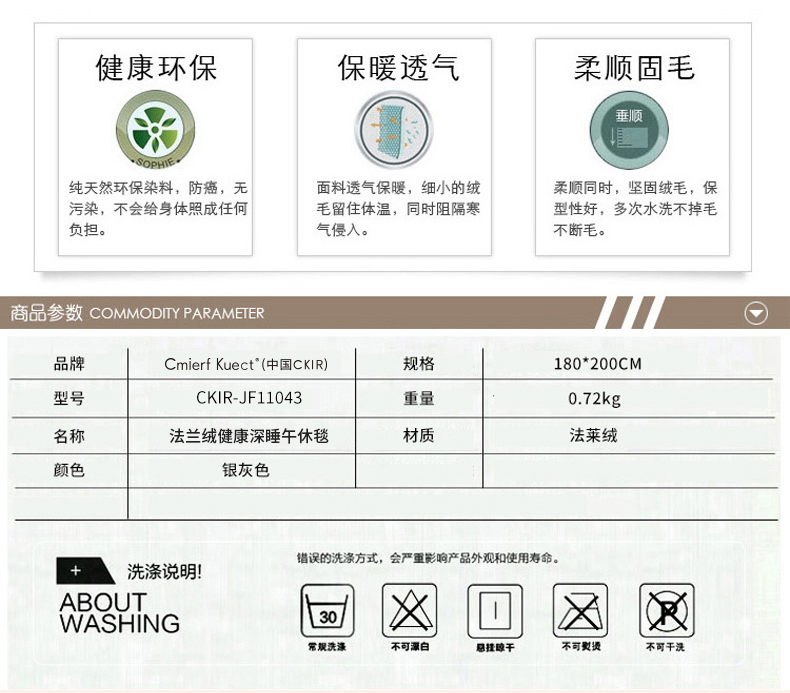 商品名称:Cmierf Kuect (中国CKIR)温裕纯色银灰法莱绒毛毯180*200cm CKIR-JF11043 (新疆,西藏,宁夏,青海,内蒙古,甘肃,黑龙江,吉林,辽宁不发货)