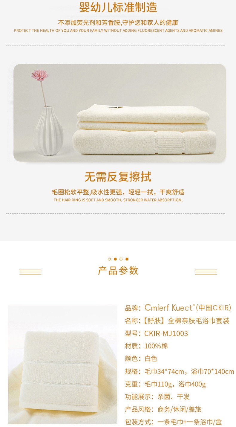 Cmierf Kuect (中国CKIR)新款纯色爱棉毛浴巾套装(一条毛巾+一条浴巾)CKIR-MJ1003 白色 (新疆,西藏,宁夏,青海,内蒙古,甘肃,黑龙江,吉林,辽宁不发货)