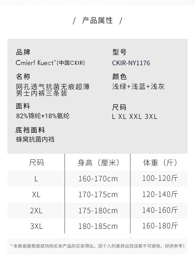 Cmierf Kuect(中国CKIR)透气抗菌无痕男士内裤三条装(浅绿+浅蓝+浅灰 ) CKIR-NY1176 L/XL/XXL/3XL下单备注尺码(新疆西藏宁夏青海内蒙古甘肃黑龙江吉林辽宁不发货)