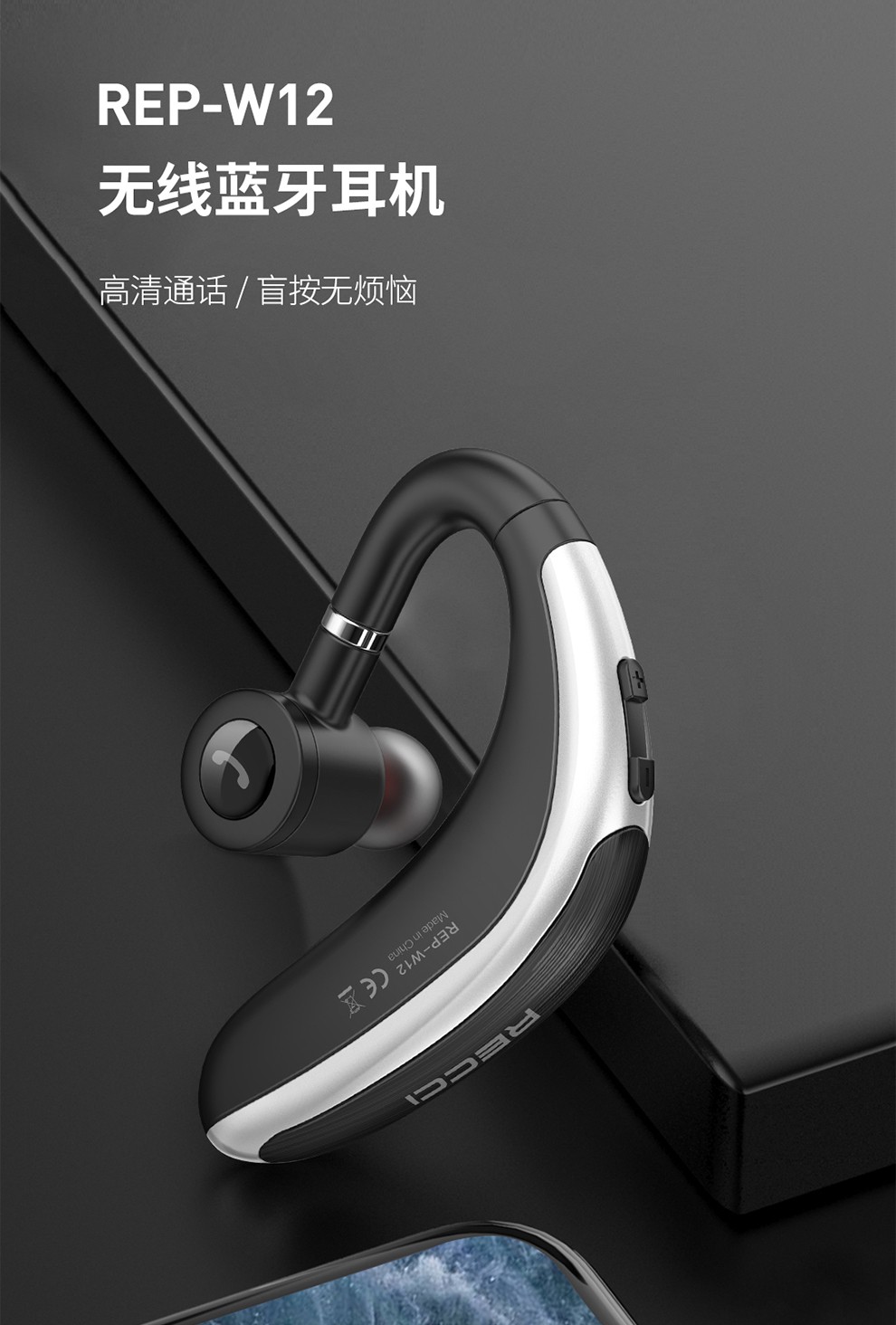 锐思(Recci)佐罗挂耳式单耳蓝牙耳机REP-W12黑色