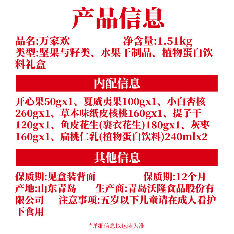 商品名称:沃隆 每日坚果 坚果炒货大颗粒干果送零食礼礼盒 万家欢1.51kg 6959479305939