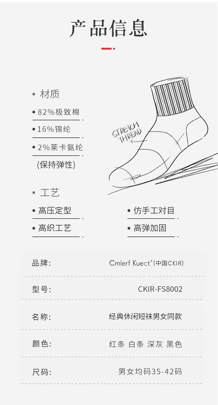 商品名称:Cmierf Kuect (中国CKIR) 经典条纹男女同款短筒袜4双CKIR-FS8002 红条 白条 深灰 黑色(新疆,西藏,宁夏,青海,内蒙古,甘肃,黑龙江,吉林,辽宁不发货)