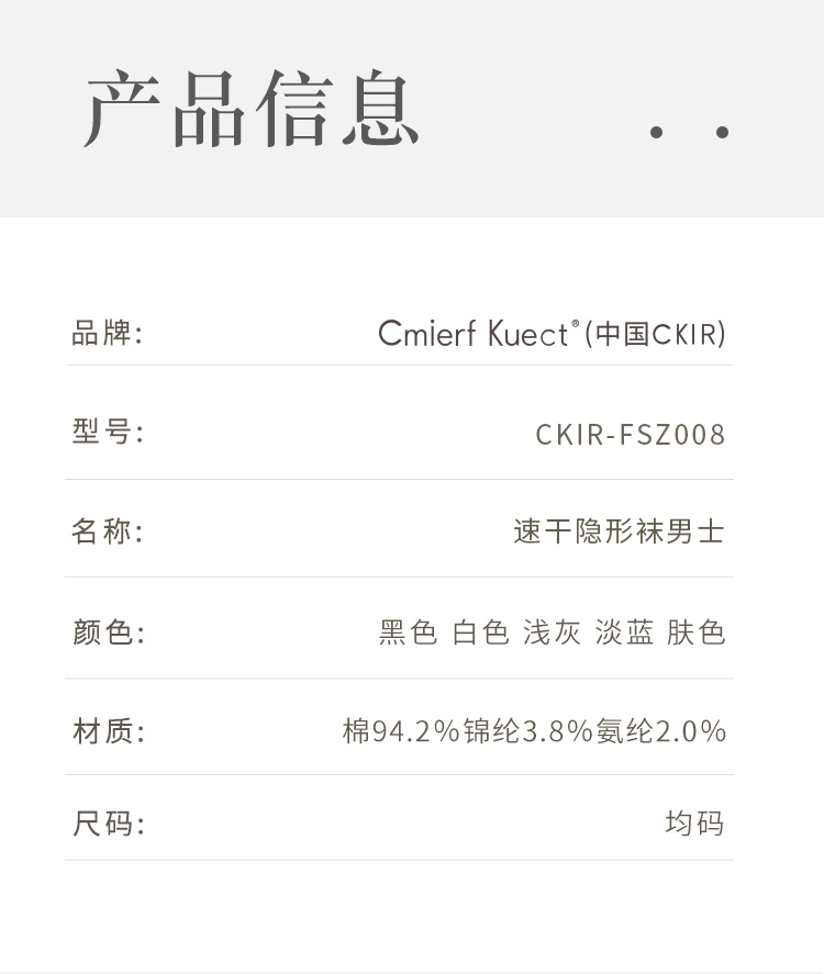 商品名称:Cmierf Kuect (中国CKIR) 男士隐形袜纯棉5双装 CKIR-FSZ008黑色 白色 浅灰 淡蓝 肤色(新疆,西藏,宁夏,青海,内蒙古,甘肃,黑龙江,吉林,辽宁不发货)