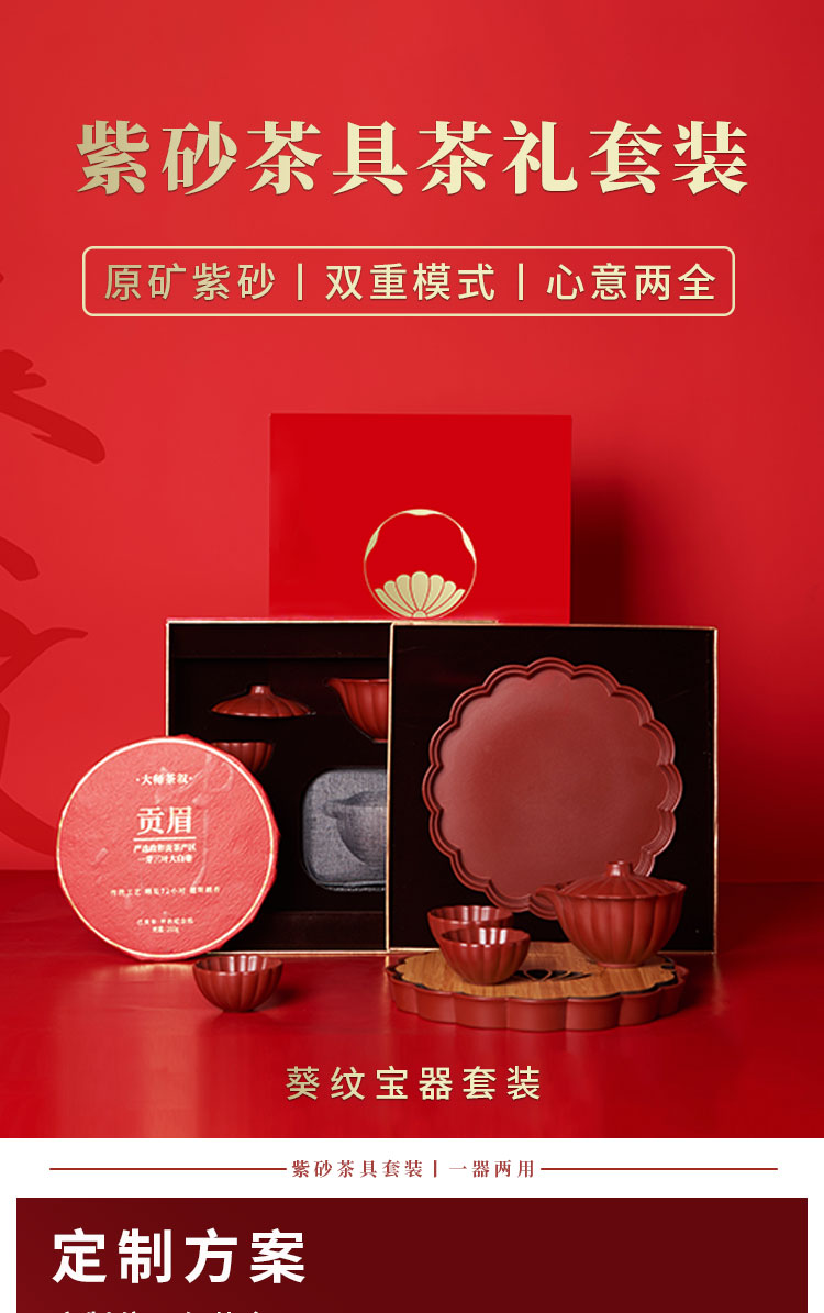 商品名称:朴清堂葵纹宝器套装 紫砂盖碗1个+紫砂口杯3个+紫砂茶盘1个+竹托盘1个+随行包1个+茶巾1块+贡眉白茶1块