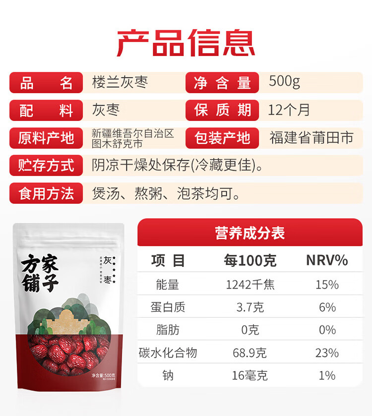 商品名称:方家铺子 五星楼兰灰枣500g/袋