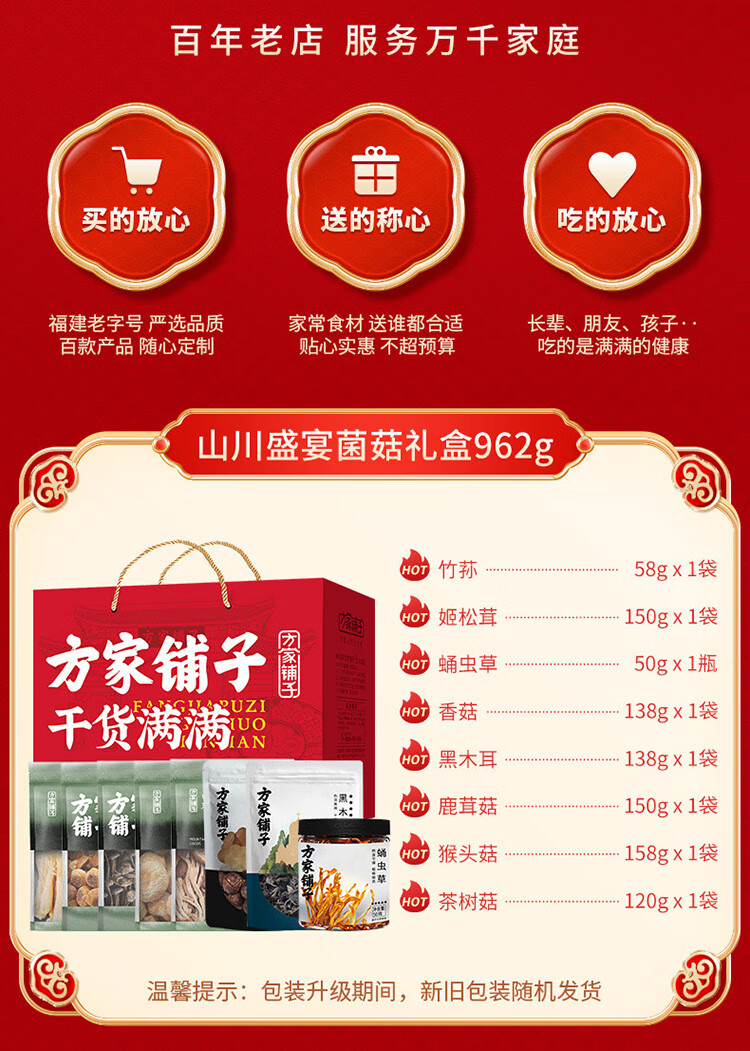 商品名称:方家铺子 山川盛宴菌菇礼盒962g/礼盒装