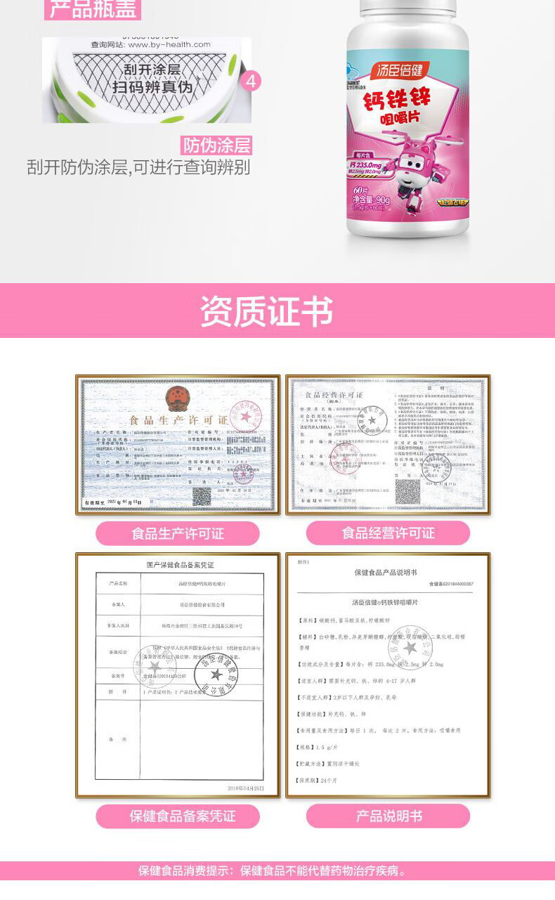 商品名称:汤臣倍健钙铁锌咀嚼片60片/瓶