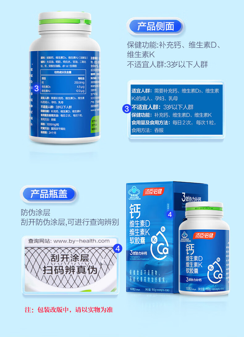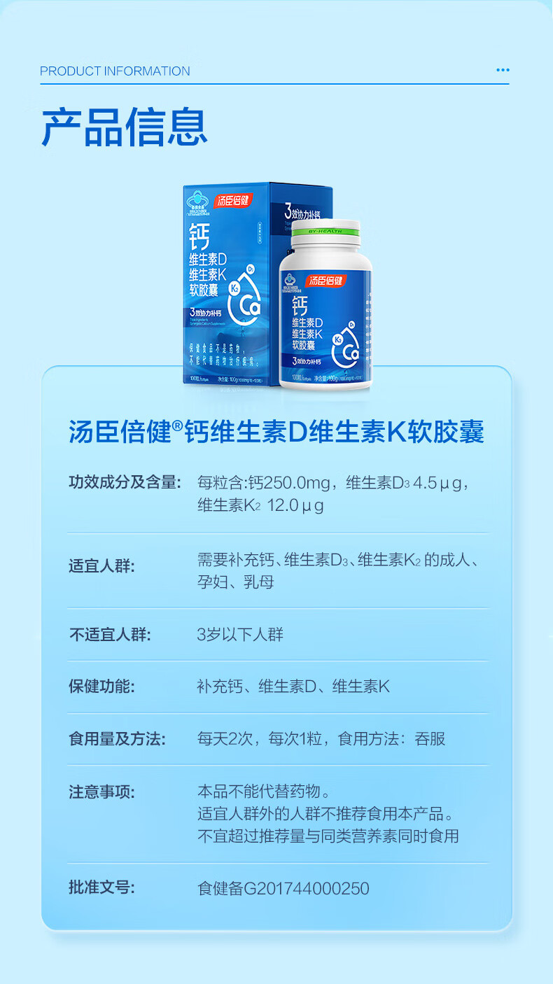 商品名称:汤臣倍健钙维生素D维生素K软胶囊 200粒/瓶
