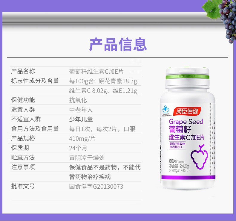 商品名称:汤臣倍健葡萄籽维生素C加E片60片/瓶