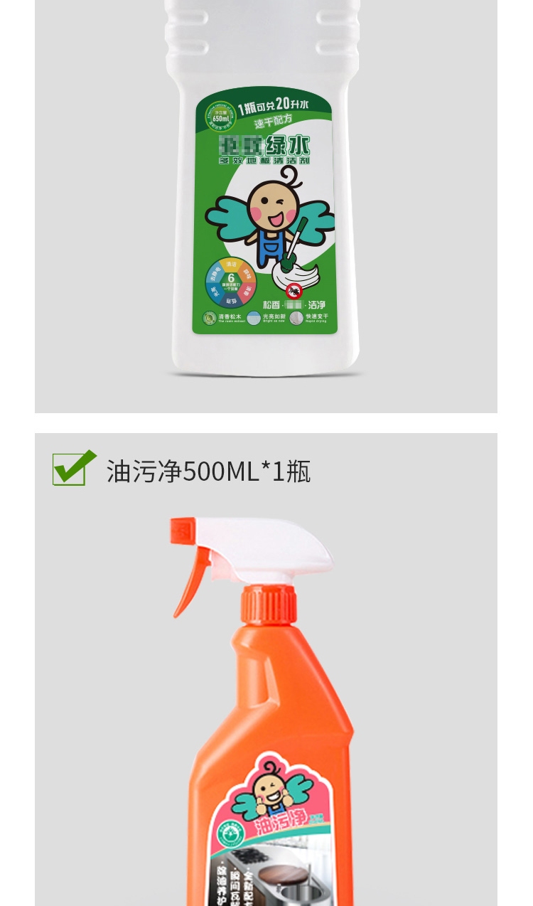 1.油污净500mlx1瓶 2.洁厕净500mlx1瓶 3.卫浴清洁水480mlx1瓶 4.驱蚊绿水多效地板清洁剂650