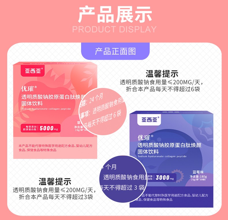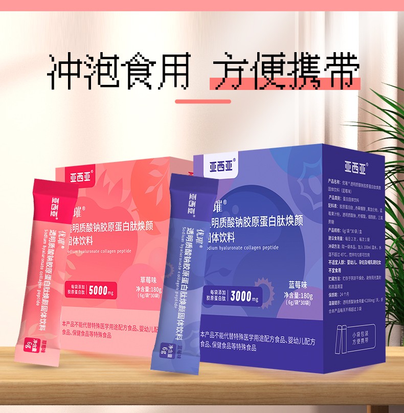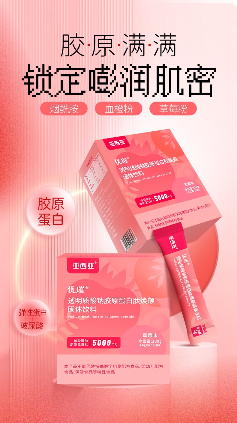 商品名称:亚西亚透明质酸钠胶原蛋白肽焕颜固体饮料(草莓味)180g/30袋