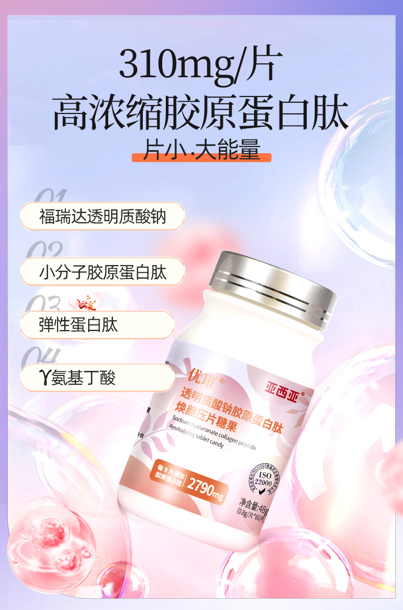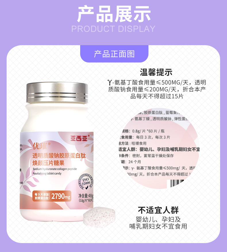 商品名称:亚西亚透明质酸钠胶原蛋白肽焕颜压片糖果 60片