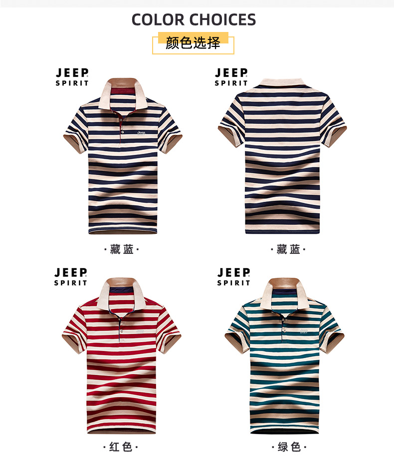 商品名称:JEEP吉普夏季男士条纹短袖POLO衫翻领弹力透气宽松大码男装时尚休闲T恤衫JPCS7223HL 红色/绿色/藏蓝色 M-4XL 下单请备注颜色尺码