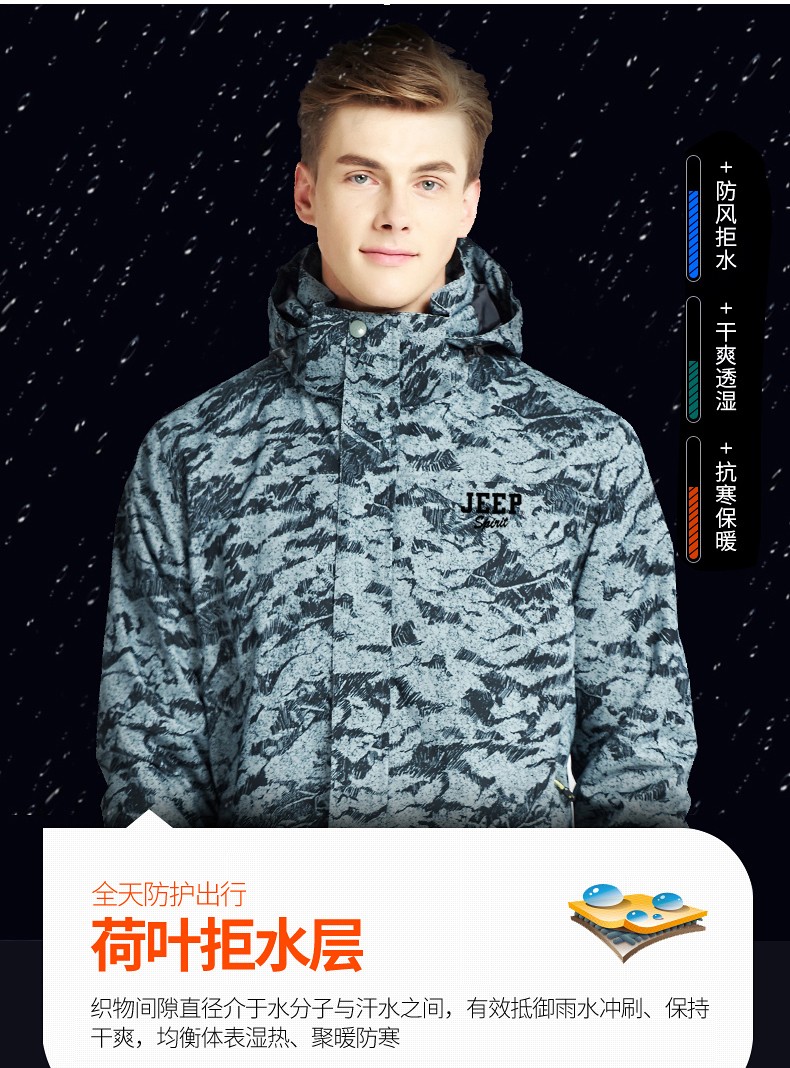 商品名称:JEEP吉普新款男女三合一冲锋衣两件套内胆抓绒衣情侣款冲锋衣外套 JPCS1004HL(男)/JPCS1004BHL(女)下单请备注颜色尺码